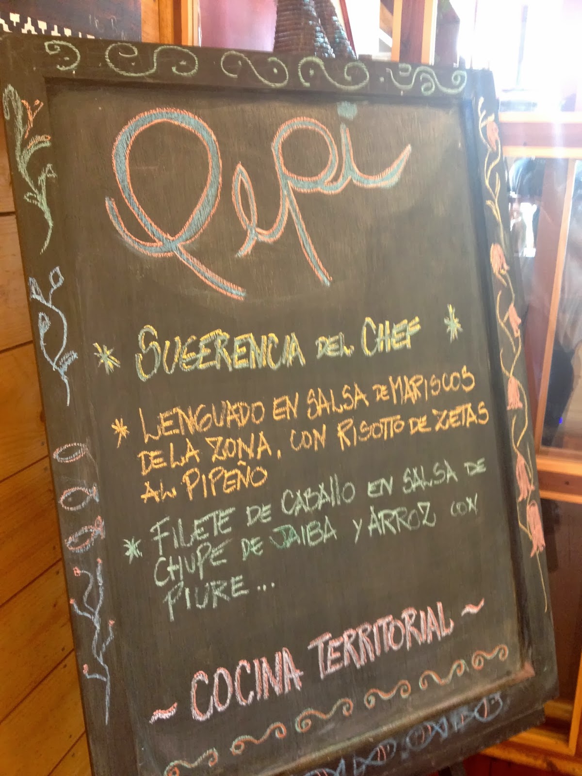 Al llegar (tipo 3.30 de la tarde) el dueño nos recibió amablemente y nos comentó que estaban un poco lentos con el servicio ya que les había fallado uno de los ayudantes de la cocina y que solo quedaban 2 platos de la sugerencia del chef. Yo ya le había echado el ojo a ese plato desde que lo vi escrito en la entrada del restaurant (Lenguado en salsa de mariscos de la zona con risotto de zetas al pipeño) por lo que los pedimos inmediatamente.